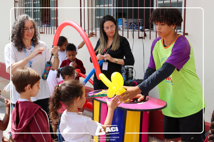 Recebidos pela diretora da creche, Sheila, e pelas professoras da instituição, as representantes da ACI participaram de uma manhã divertida com os alunos do Berçário e Educação Infantil. A programação contou com atividades recreativas conduzidas pela equipe da Fábrica dos Sonhos, com direito a pipoca, algodão-doce, pintura facial e esculturas de balões.