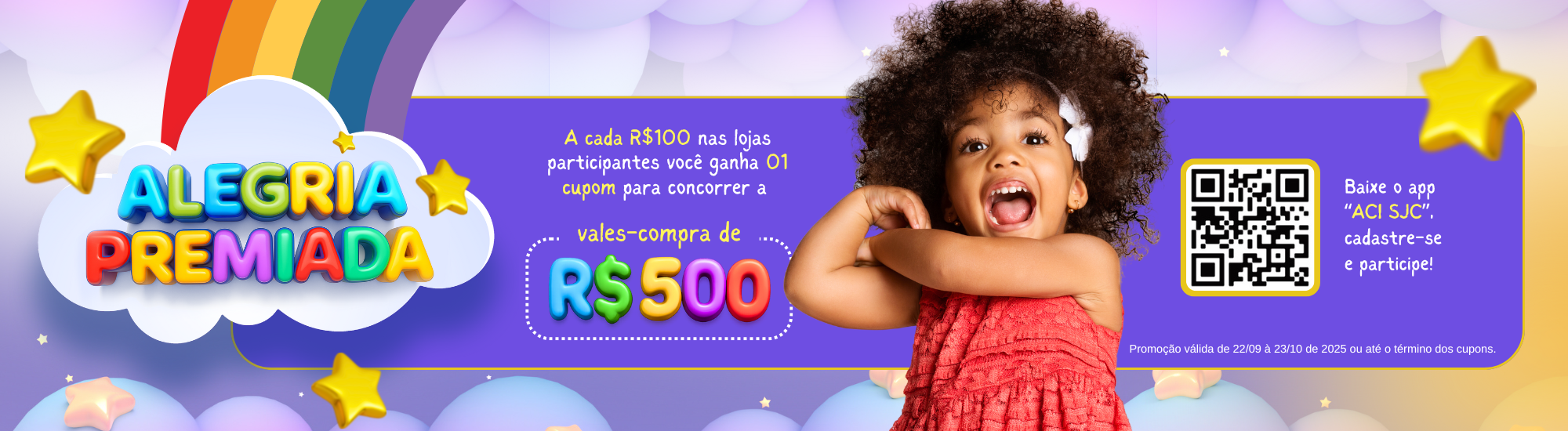 A campanha segue até o final de outubro com mais chances de ganhar! O segundo e último sorteio será realizado no dia 24/10. Para participar, basta comprar nas lojas participantes e cadastrar seus cupons no aplicativo ACI SJC, disponível gratuitamente nas lojas de apps.