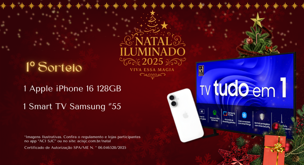 Nesta segunda-feira, 08 de dezembro de 2025, a ACI-SJC realizou o primeiro sorteio da campanha "Natal Iluminado 2025: Viva essa Magia". Entre milhares de cupons cadastrados, dois participantes foram contemplados com prêmios incríveis: um iPhone 16 e uma Smart TV Samsung 55”.